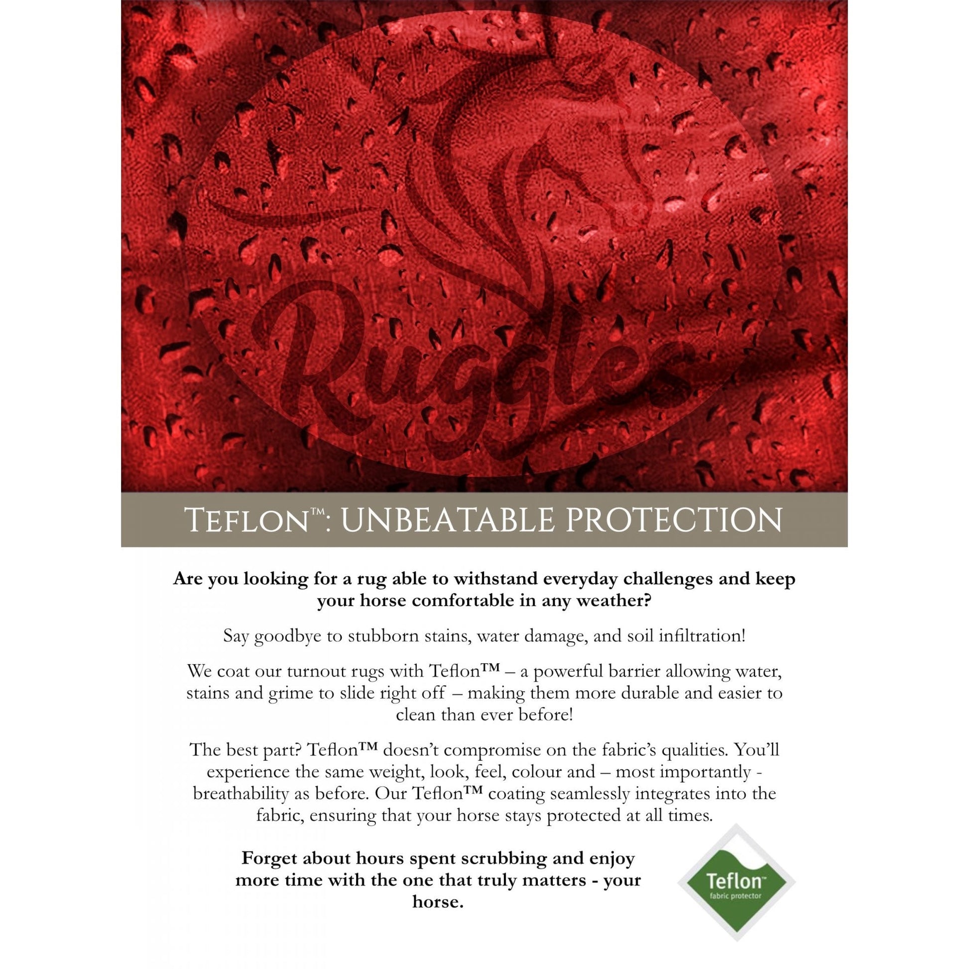 The rug includes a generous tail flap with reflective strip, detachable webbing leg straps, and a wither protector for comfort. Velcro fastenings enable attachment of a separate neck cover. Double adjustable surcingle straps with rubber washers help stop unfastening.