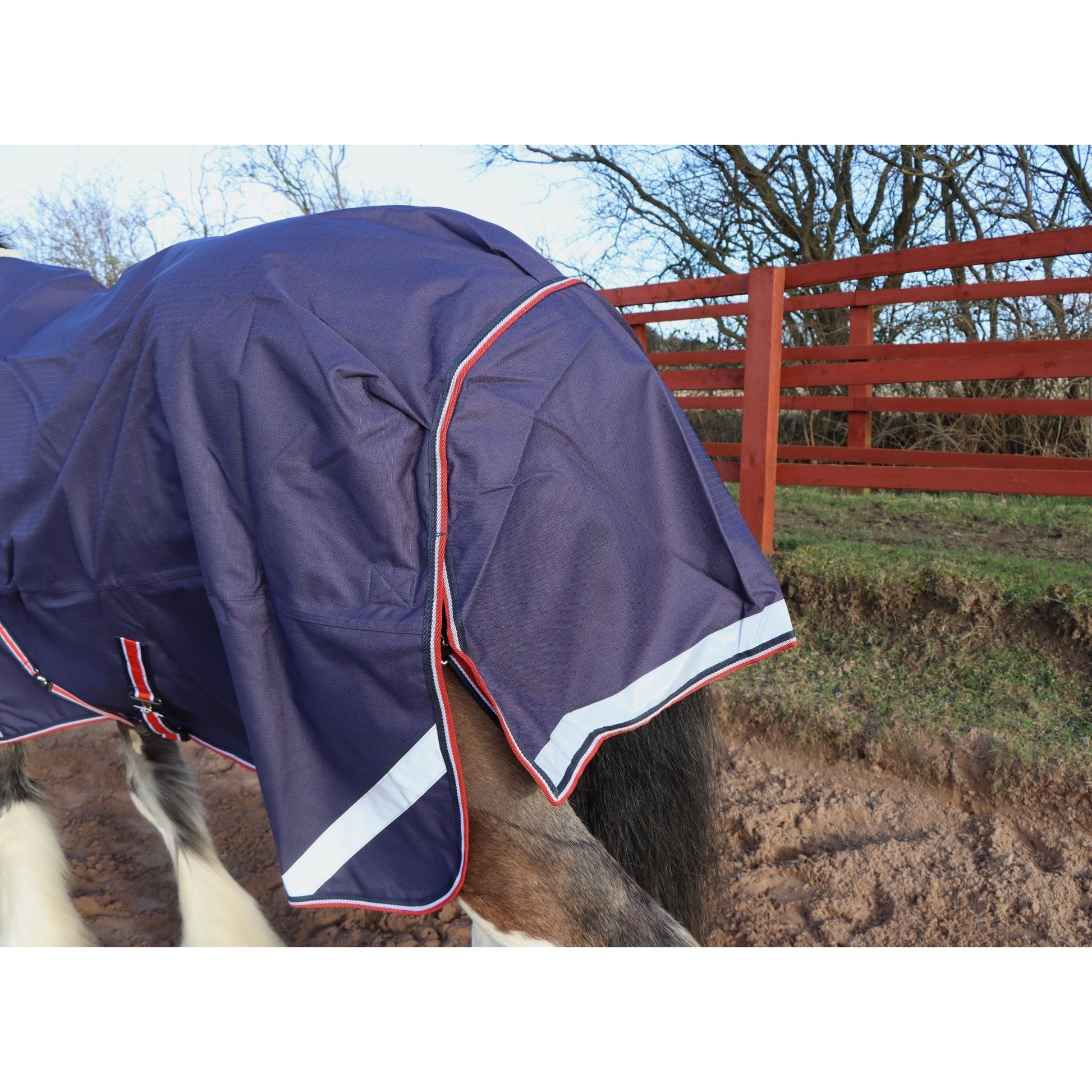 Additional features include cross surcingles with rubber washers to help unfastening, a generous tail flap with reflective strips, and a generous shoulder pleat for ease of movement, complemented by a wither protector.