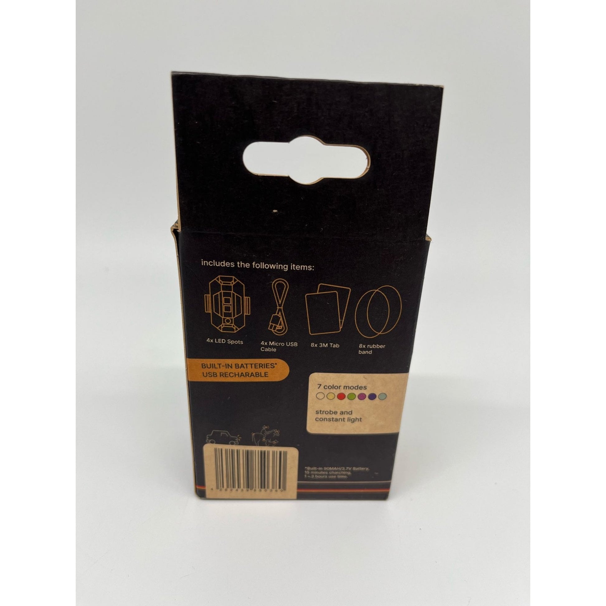 - Each box contains four individual packets with light, charger, and fastening accessories.