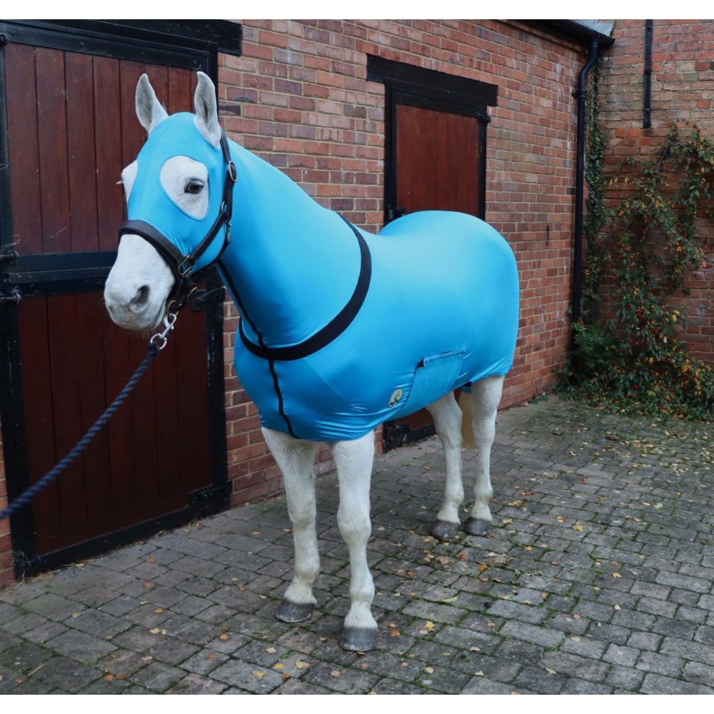 This Lycra body suit with detachable tail sleeve is made from 200g four way stretch Nylon. For ease of putting on and off and for those horses that don't like hoods or suits being pulled over the head, this suit has a zip all the way from chin to chest. There is soft fleece at the noseband and the shoulder line for comfort. The belly band is fixed with two high quality Velcro strips and the tail sleeve is detachable. Leg straps help to keep the back end of the suit in place. This suit has sealed seams rather than stitched seams, which means it is flat and therefore helps to keep the coat smoother. The suit is machine washable but only on a cool or warm cycle or by hand and needs to dry naturally. As a guide, we recommend the following sizes, noting it is not designed for Shetlands or Heavy Horses:
