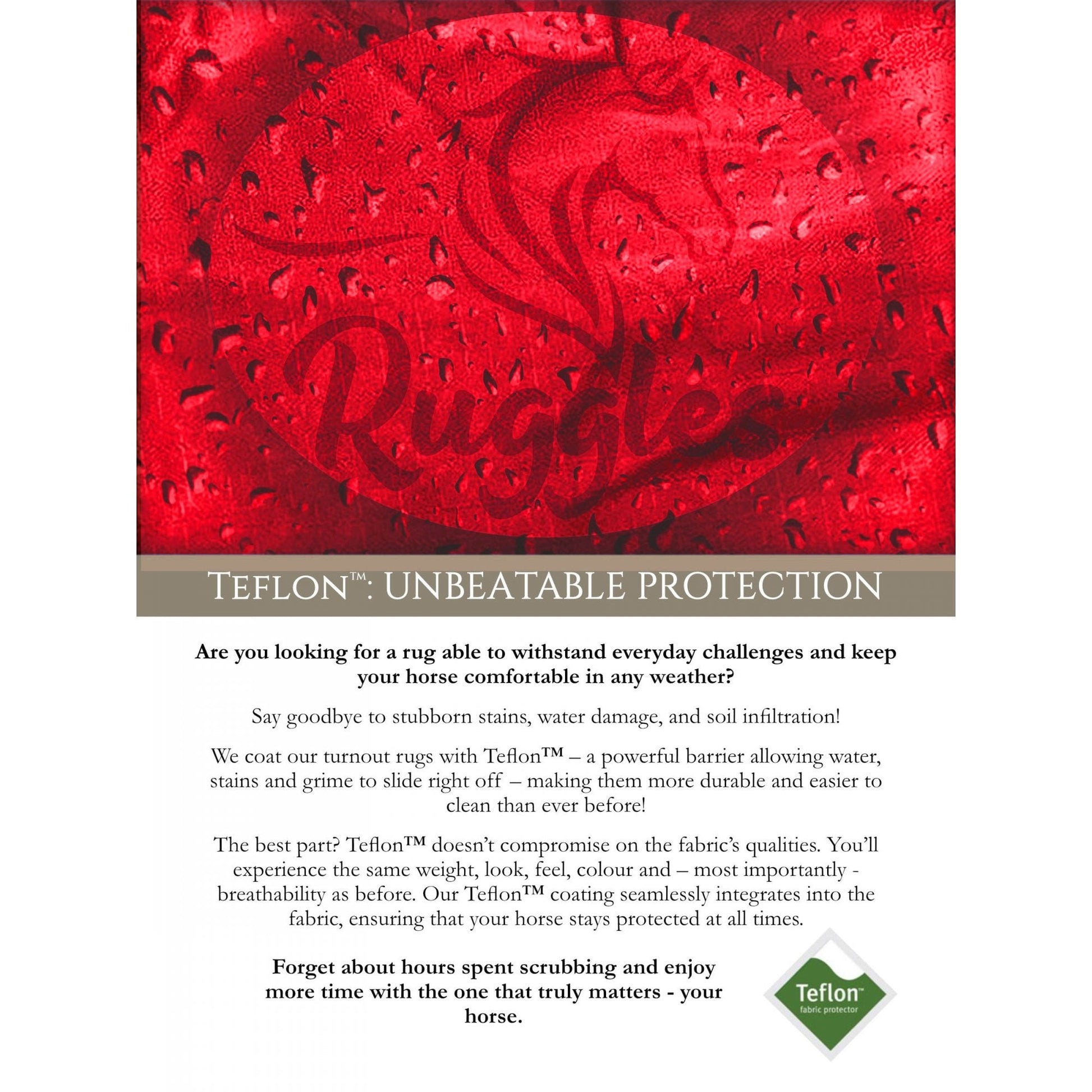 This rug is made from 1200D waterproof and breathable outer, featuring a Teflon™ coating for added water and stain repellent properties, as well as enhanced windproofing. The underside includes a soft nylon lining to help prevent rubbing and maintain a smooth coat.
